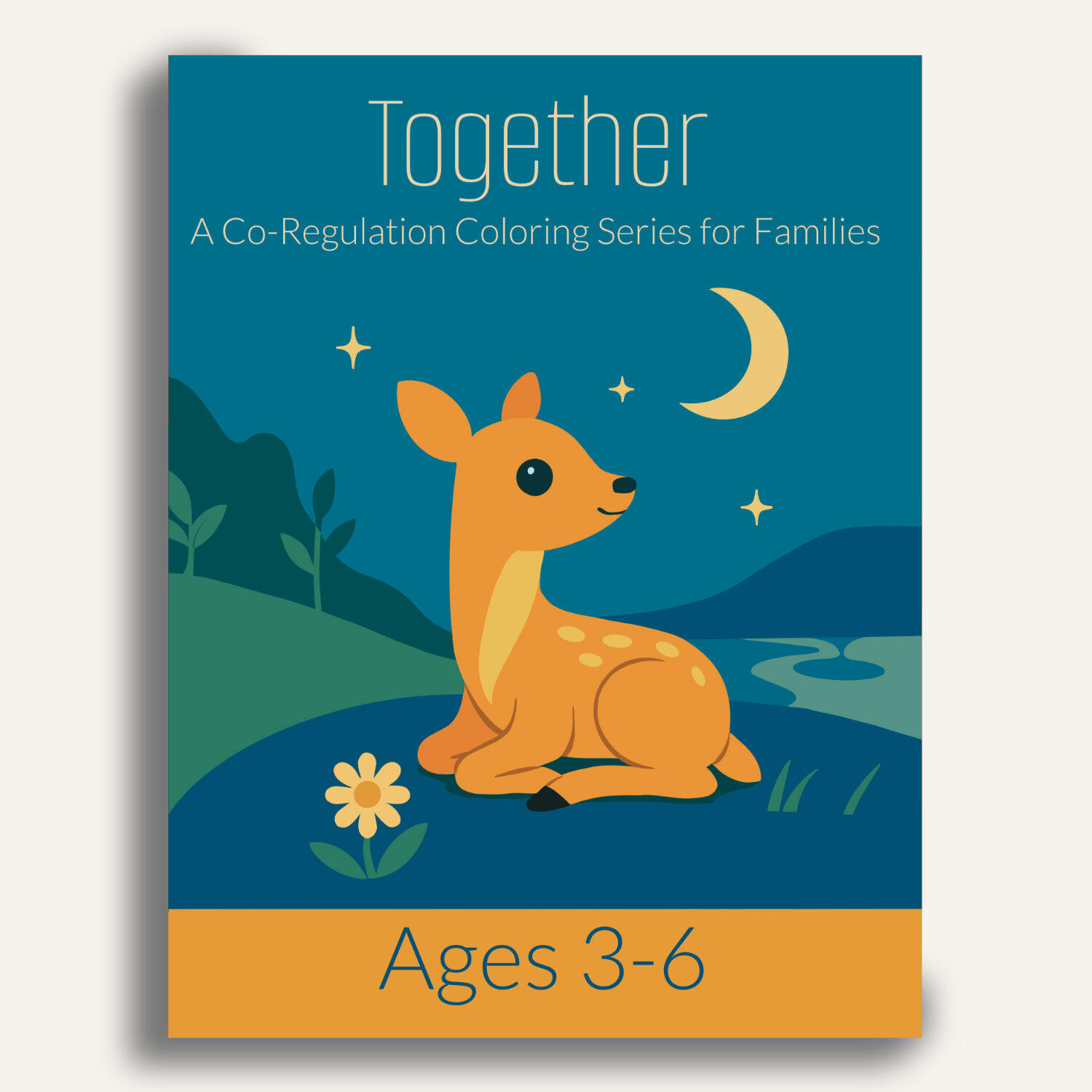 A co-regulation coloring book for children (ages 3-6). Pairs with Adult's edition and ages and 7-12 - each page features the same animal at age-appropriate detail levels so families can color together and reconnect through shared presence.