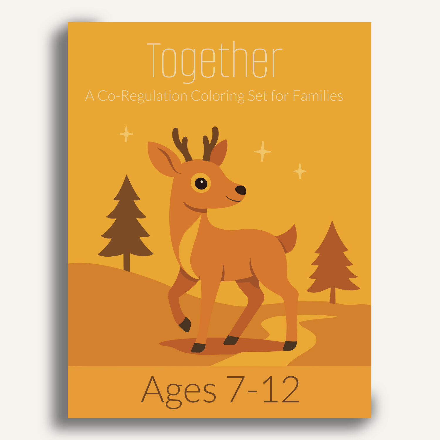 A co-regulation coloring book for children (ages 7-12). Pairs with Adult's edition and ages and 3-6 - each page features the same animal at age-appropriate detail levels so families can color together and reconnect through shared presence.