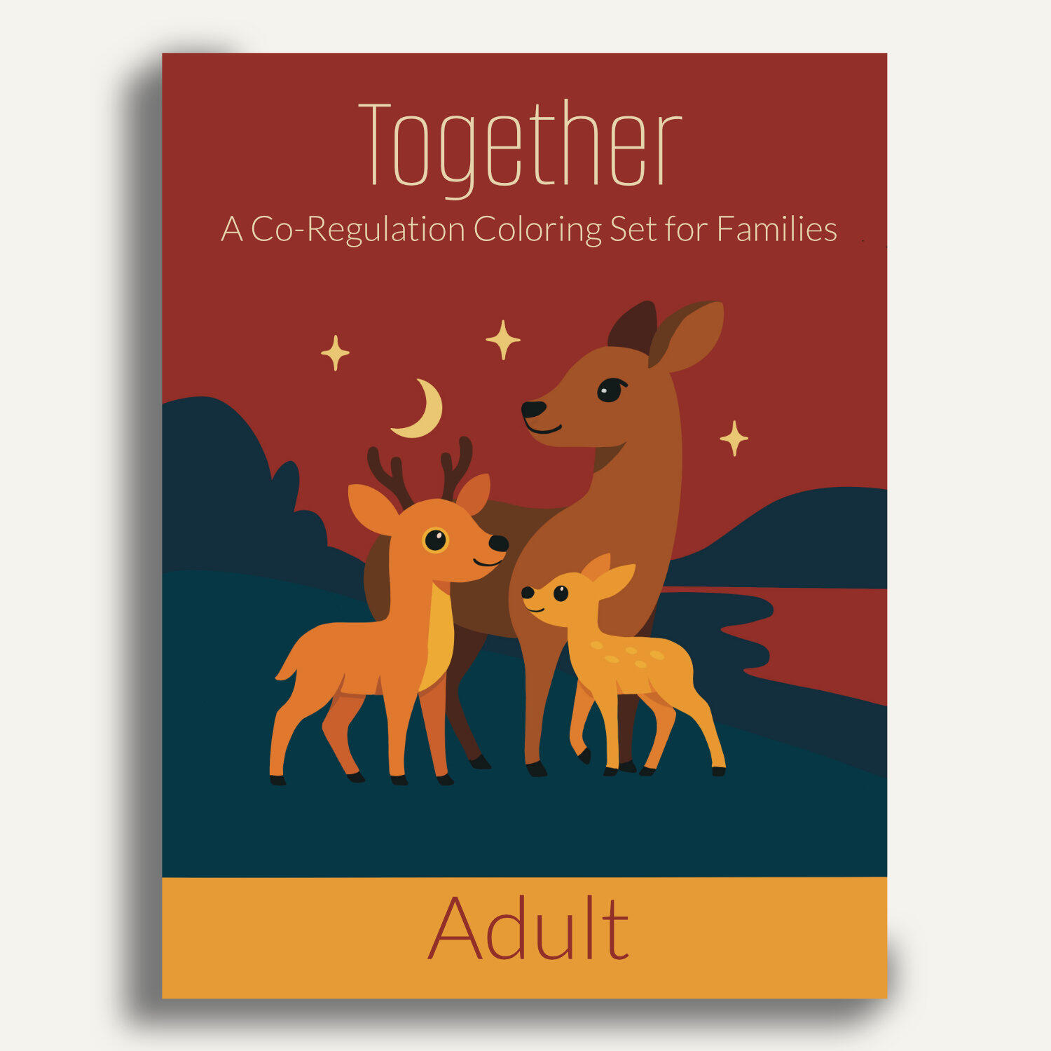 The adult edition of a three-book co-regulation coloring set. Each page mirrors the same animal across all three editions (adult, ages 7-12, ages 3-6) with age-appropriate detail.Designed for families to color side by side, slow down, and reconnect - one breath, one page at a time.